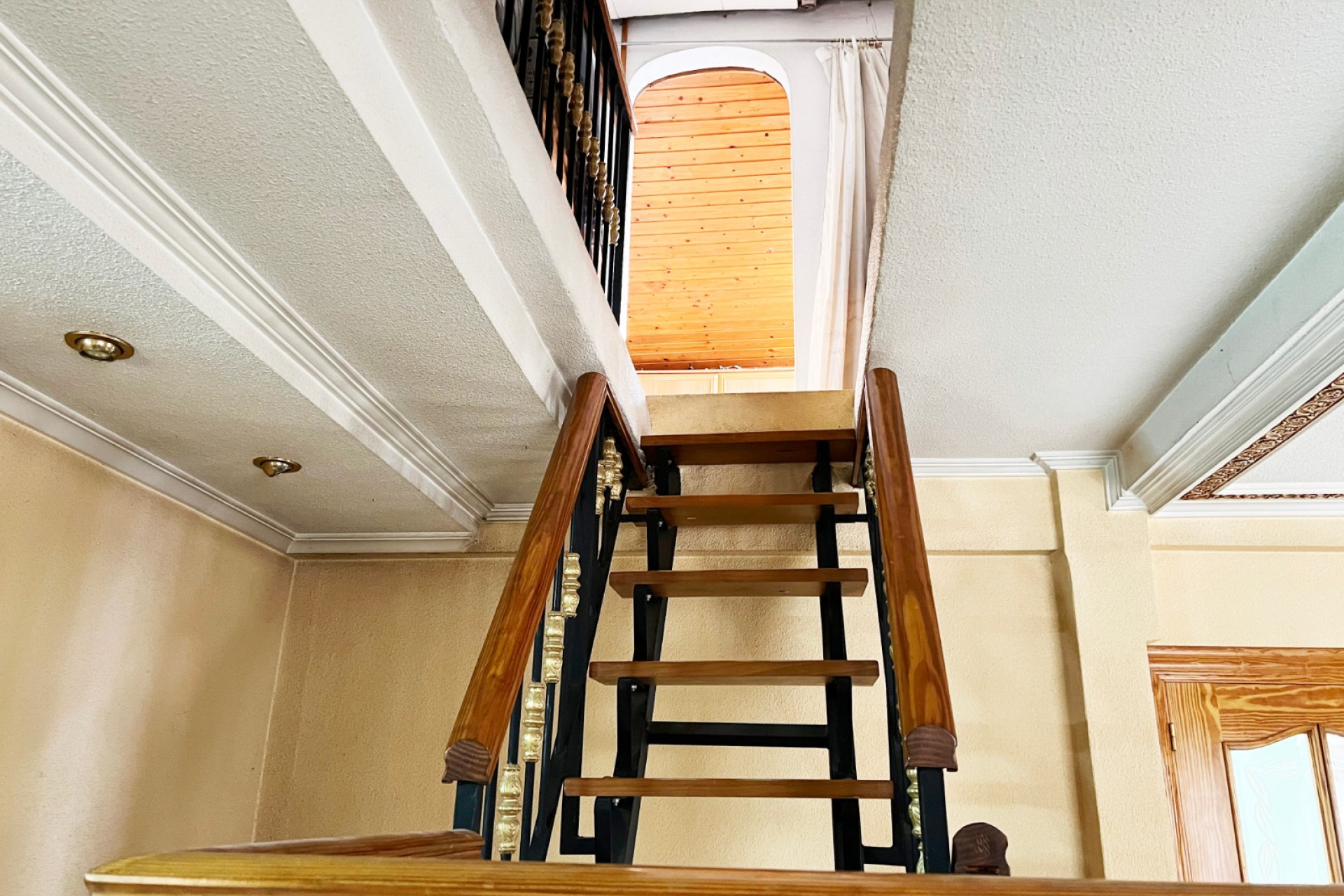 Gelegen in een prachtige natuurlijke omgeving, is deze villa in La Romana een oase van rust, omringd door bergen, wijngaarden, olijfbomen en amandelbomen. Bij binnenkomst via een automatische schuifpoort worden we verwelkomd door een ruime tuin met ontspanningsruimtes, pergola’s om van de zon te genieten en een carport om uw auto beschut te parkeren. Aan de achterzijde nodigt een verfrissend zwembad uit tot ontspanning, terwijl de zomerkeuken met barbecue garant staat voor gezellige bijeenkomsten in de buitenlucht. Daarnaast zijn er een olijfgaard en een opslagruimte die als werkplaats is ingericht. De woning is verdeeld over twee verdiepingen, elk met een eigen karakter. De eerste verdieping is bereikbaar via een elegante trap die leidt naar een panoramisch balkon met een adembenemend 360° uitzicht. Binnen vinden we een ruime en lichte woon-eetkamer met een open, volledig uitgeruste keuken. Drie ruime slaapkamers met inbouwkasten en een gezinsbadkamer maken deze verdieping compleet. Vanuit de eetkamer leidt een metalen trap naar een zolderruimte, momenteel in gebruik als opslag. De begane grond verrast met een rustieke en warme stijl. Een grote woon-eetkamer met open haard, houten plafonds en natuurstenen kolommen zorgen voor een authentieke en sfeervolle ambiance. De open keuken met een ruim werkblad en een slaapkamer met een badkamer maken deze verdieping zelfstandig, ideaal voor gastenverblijf. Vanuit deze ruimte heeft u directe toegang tot de veranda en de tuin, waar binnen- en buitenleven naadloos in elkaar overlopen. Deze villa biedt de perfecte balans tussen landelijke charme en modern comfort, op een bevoorrechte locatie in het binnenland van de Costa Blanca. Laat u betoveren door de authenticiteit!