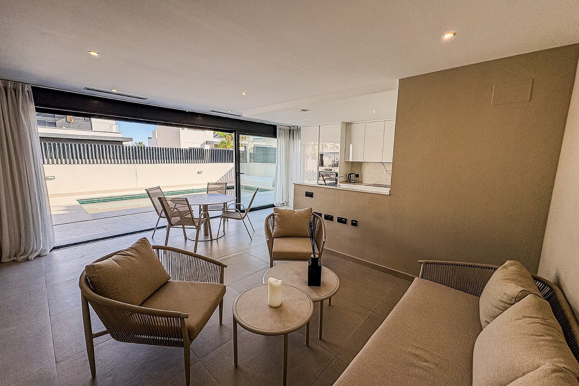 Begane grond: Een comfortabele slaapkamer, een luxe badkamer en een apart gastentoilet. Een lichte, open woon- en eetkamer met uitzicht op de tuin en het zwembad. Tevens een aparte wasruimte met extra opbergruimte.