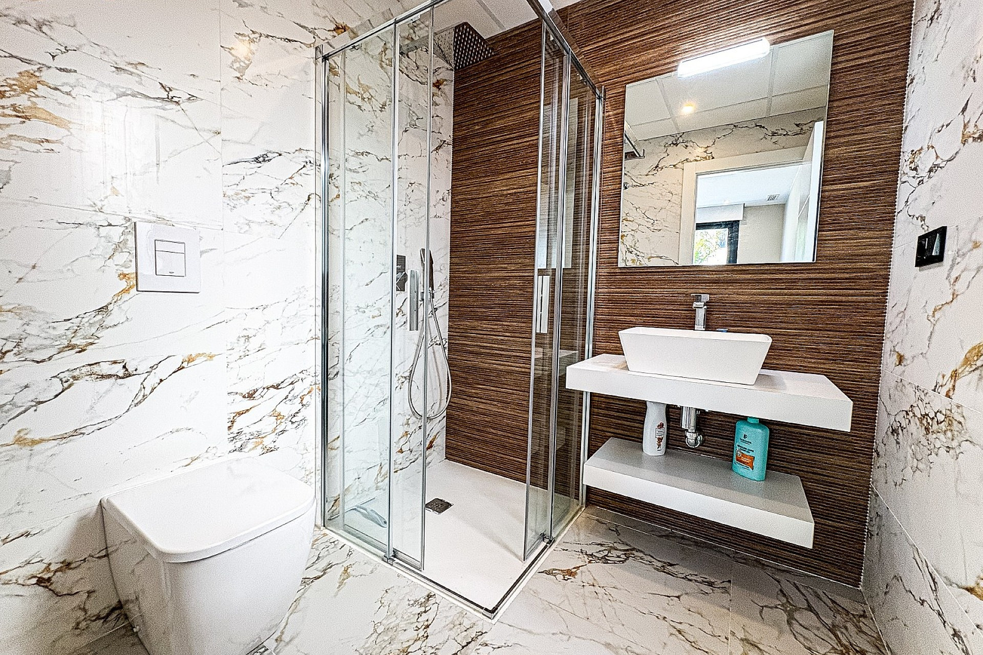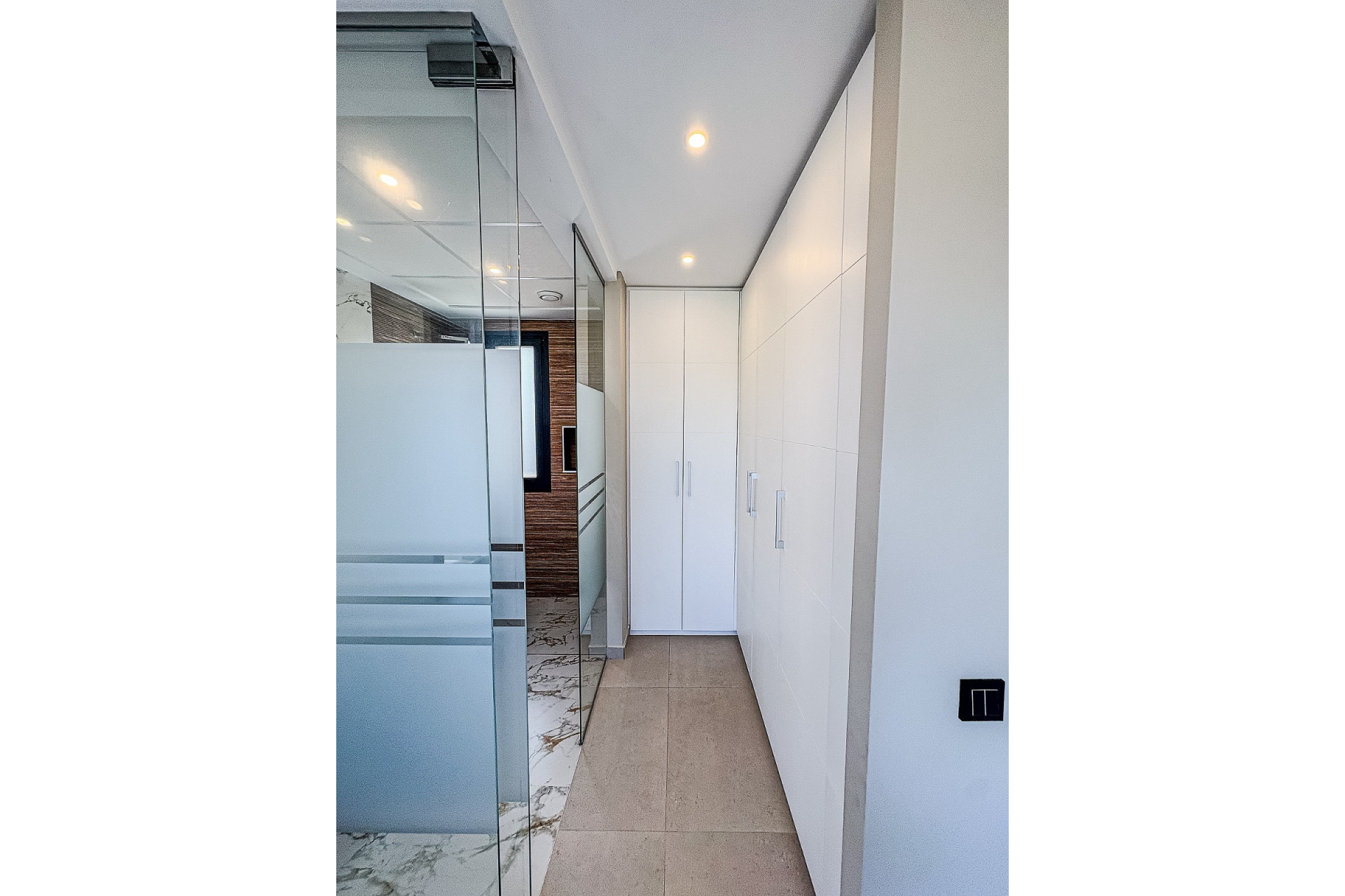 Het dakterras beschikt over een pergola die schaduw biedt tijdens warme dagen. Vanaf hier geniet u van panoramisch uitzicht over de kust en de omliggende bergen. De villa heeft een privé verwarmd zwembad (7x3 m) met kleurrijke verlichting en elektrische afdekking – groter dan de standaard 6x3 m, voor extra luxe en ontspanning.