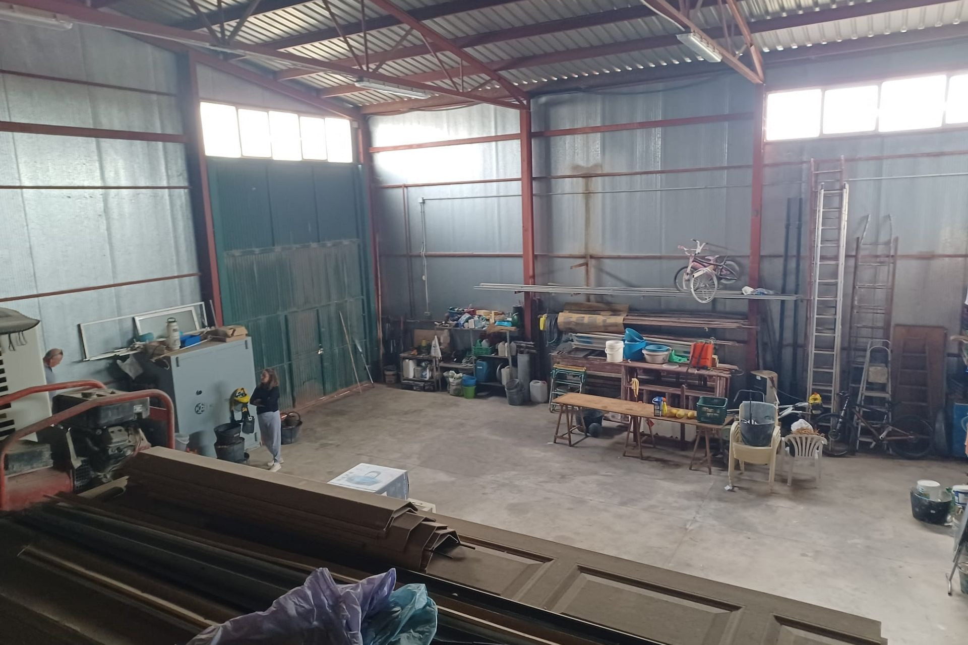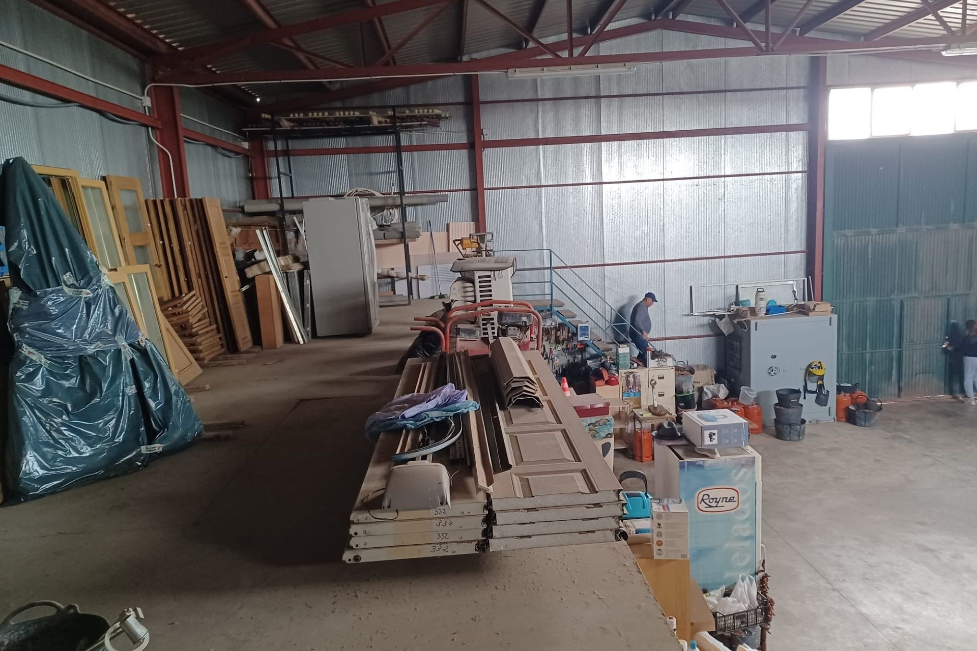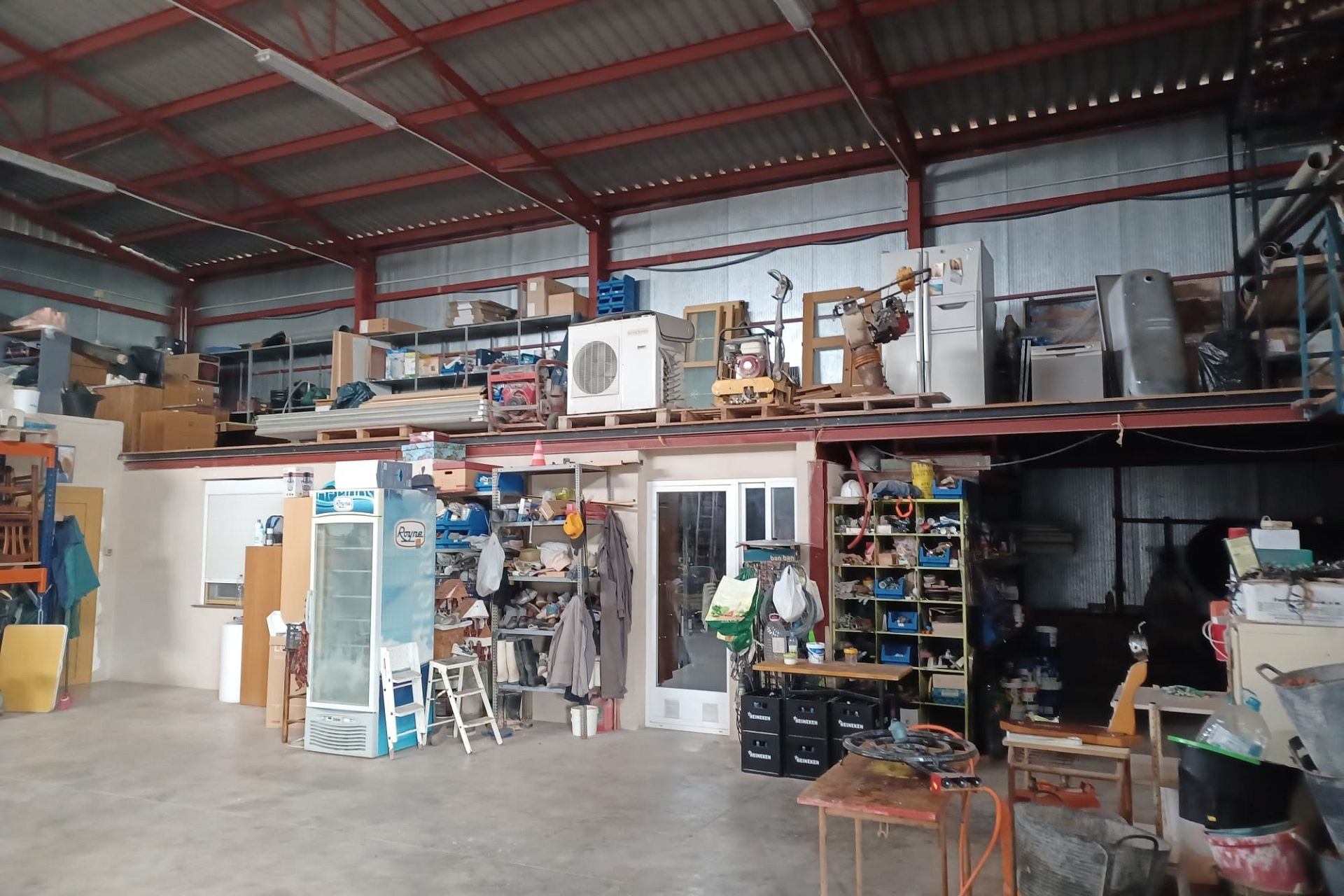 Het huis heeft een tussendeur die toegang geeft tot de enorme werkplaats/opslagruimte. Er is ook een mezzanine met een trap die extra opslagruimte biedt. Een grote deur biedt toegang voor grote voertuigen.
