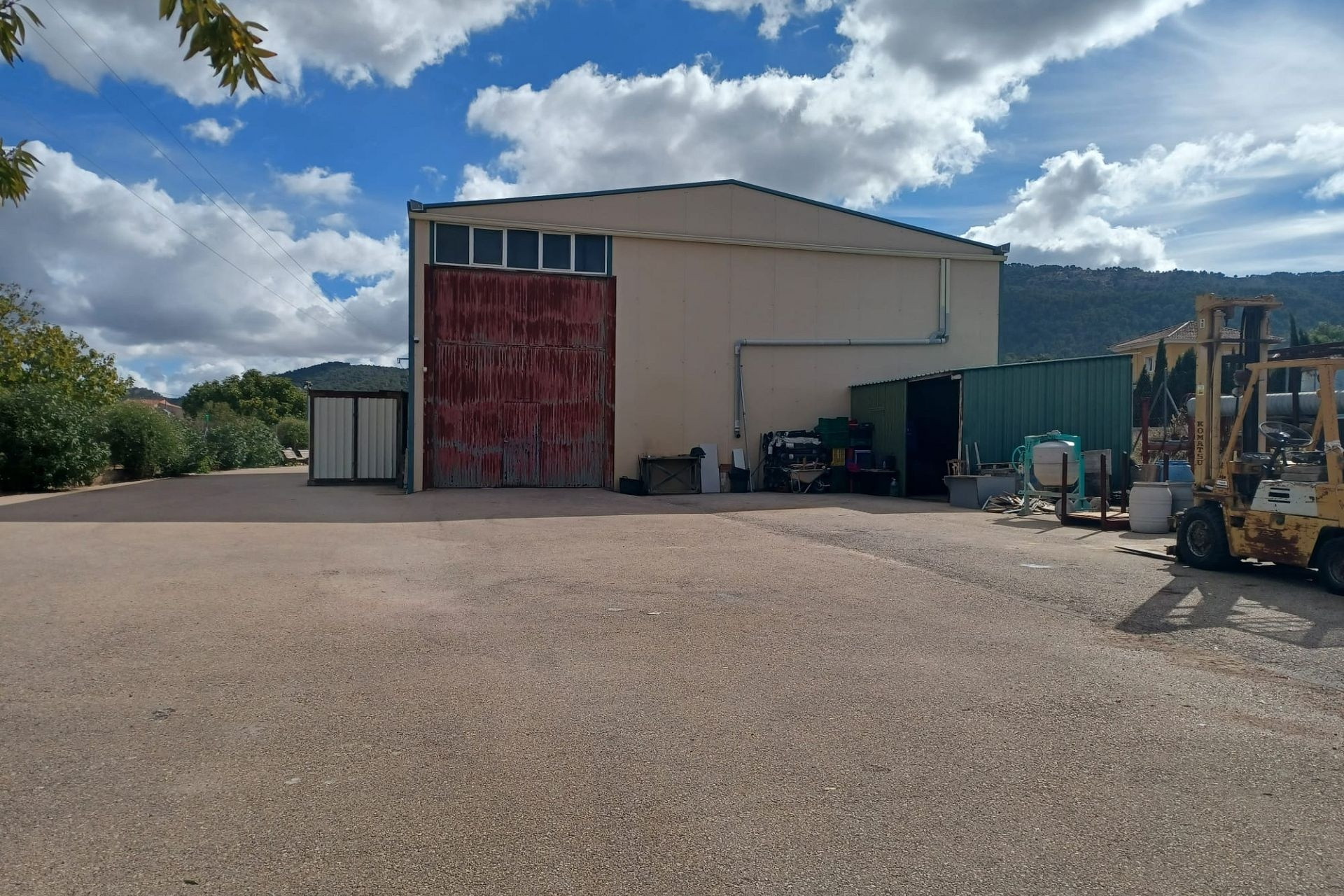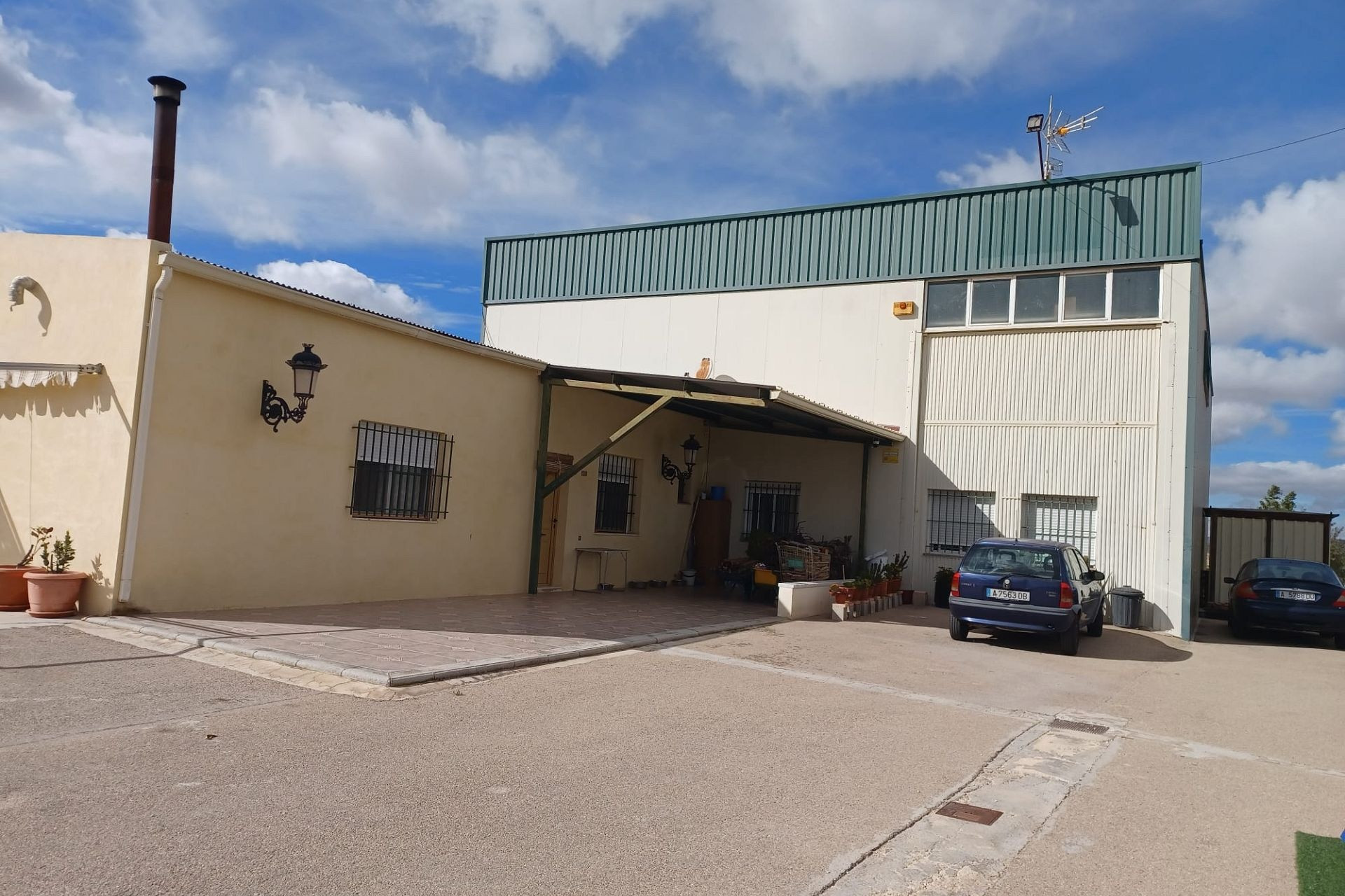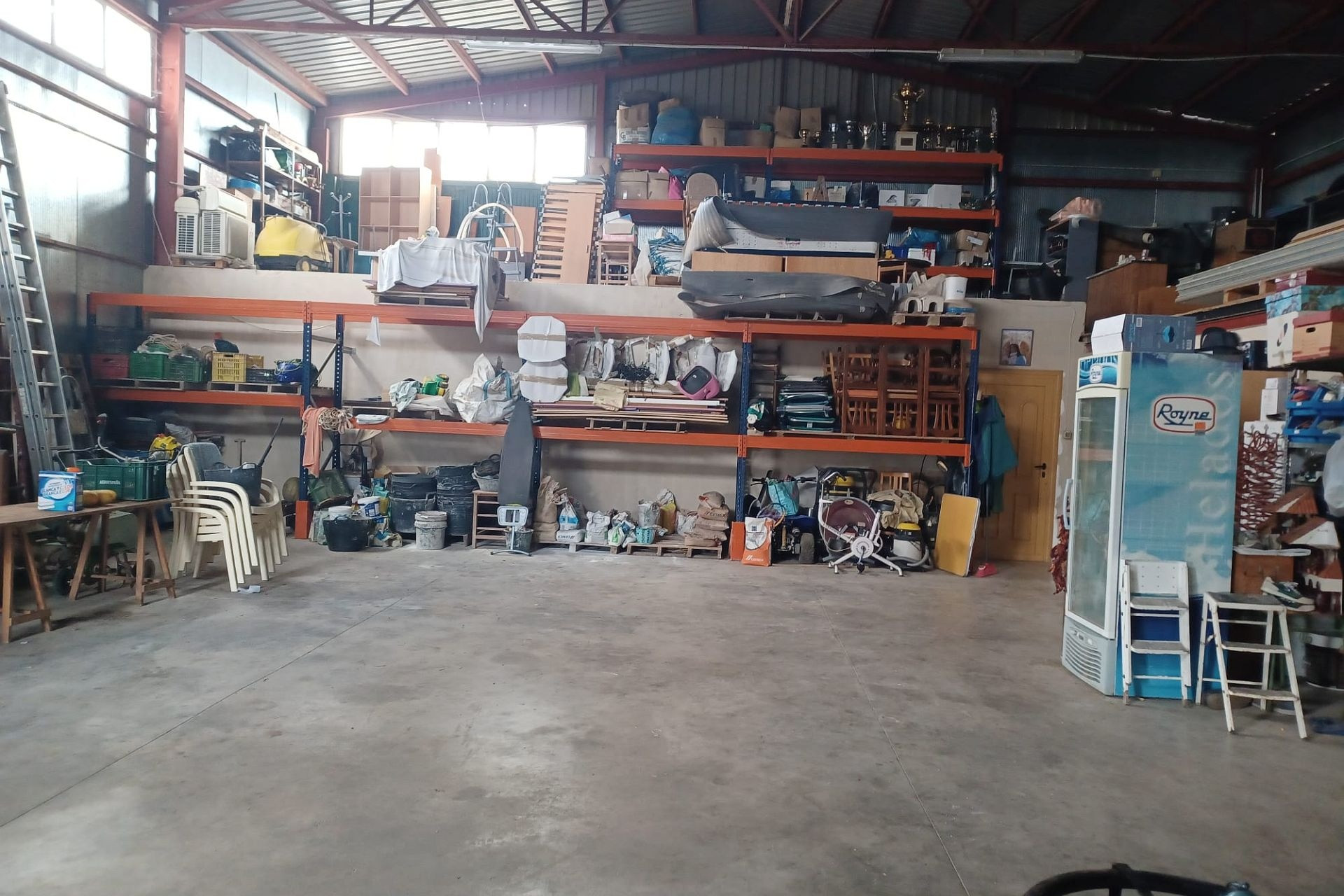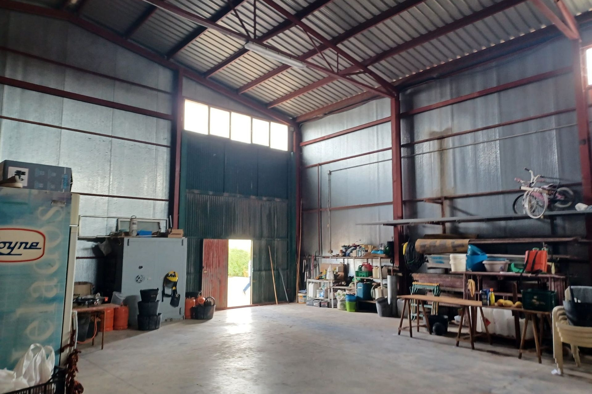 Het huis heeft een tussendeur die toegang geeft tot de enorme werkplaats/opslagruimte. Er is ook een mezzanine met een trap die extra opslagruimte biedt. Een grote deur biedt toegang voor grote voertuigen.