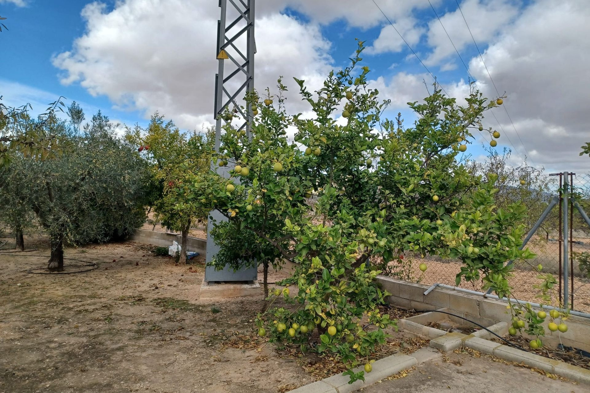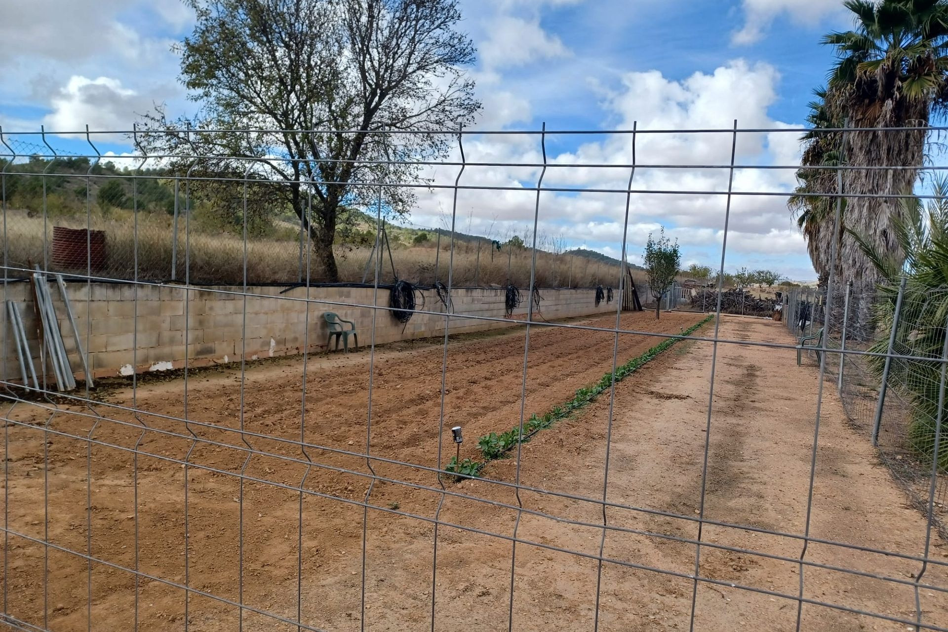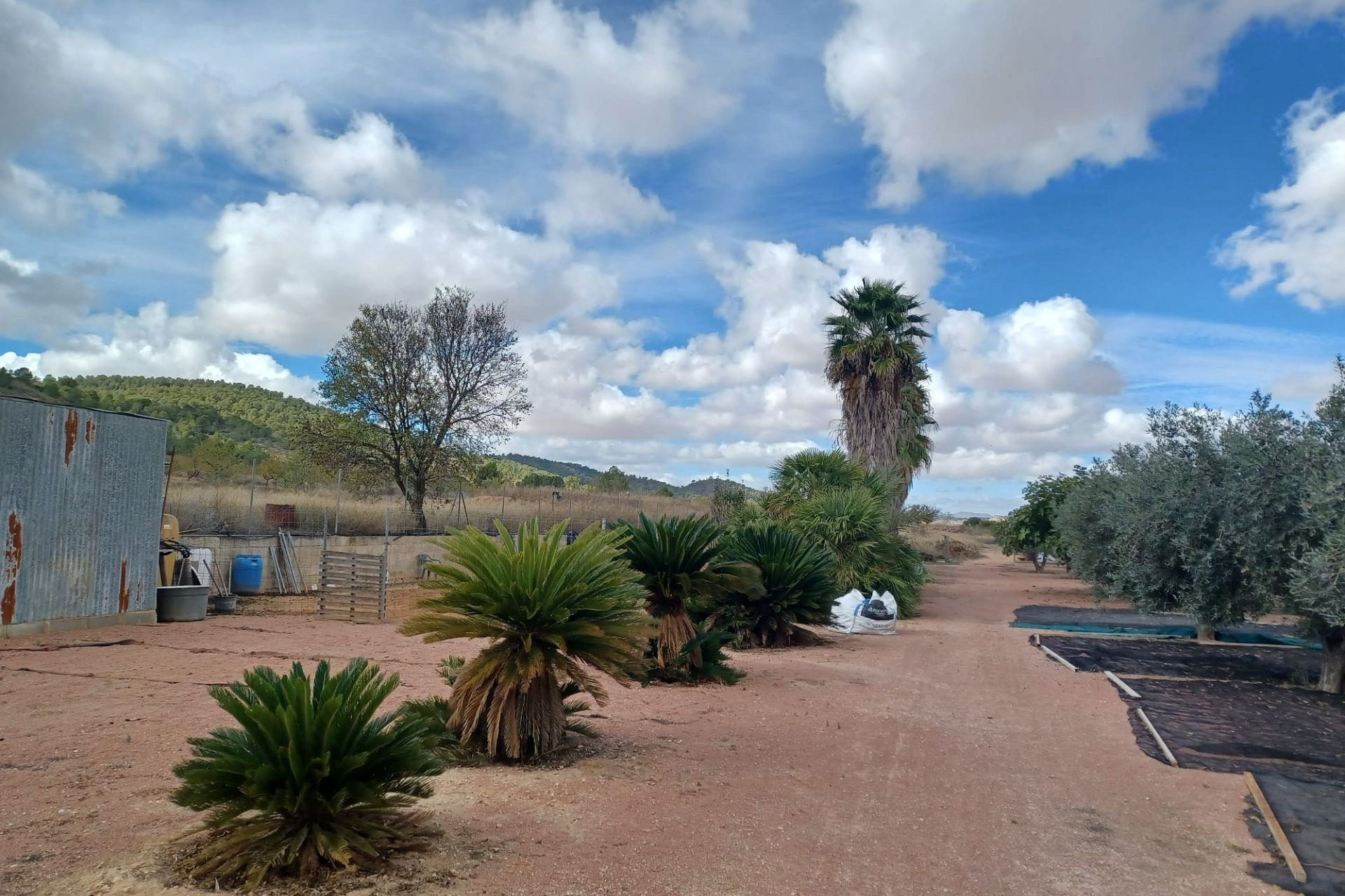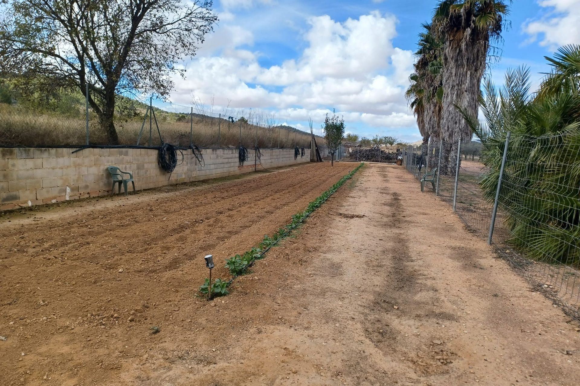 Aan de voor- en achterzijde van het pand bevinden zich verharde terrassen, evenals een poort die toegang geeft tot een moestuin en dierenverblijven. Er staan ook 30 volwassen olijfbomen, samen met een assortiment fruitbomen en palmen. Aan het einde van het perceel bevindt zich een poort die toegang geeft vanaf de andere onverharde weg.