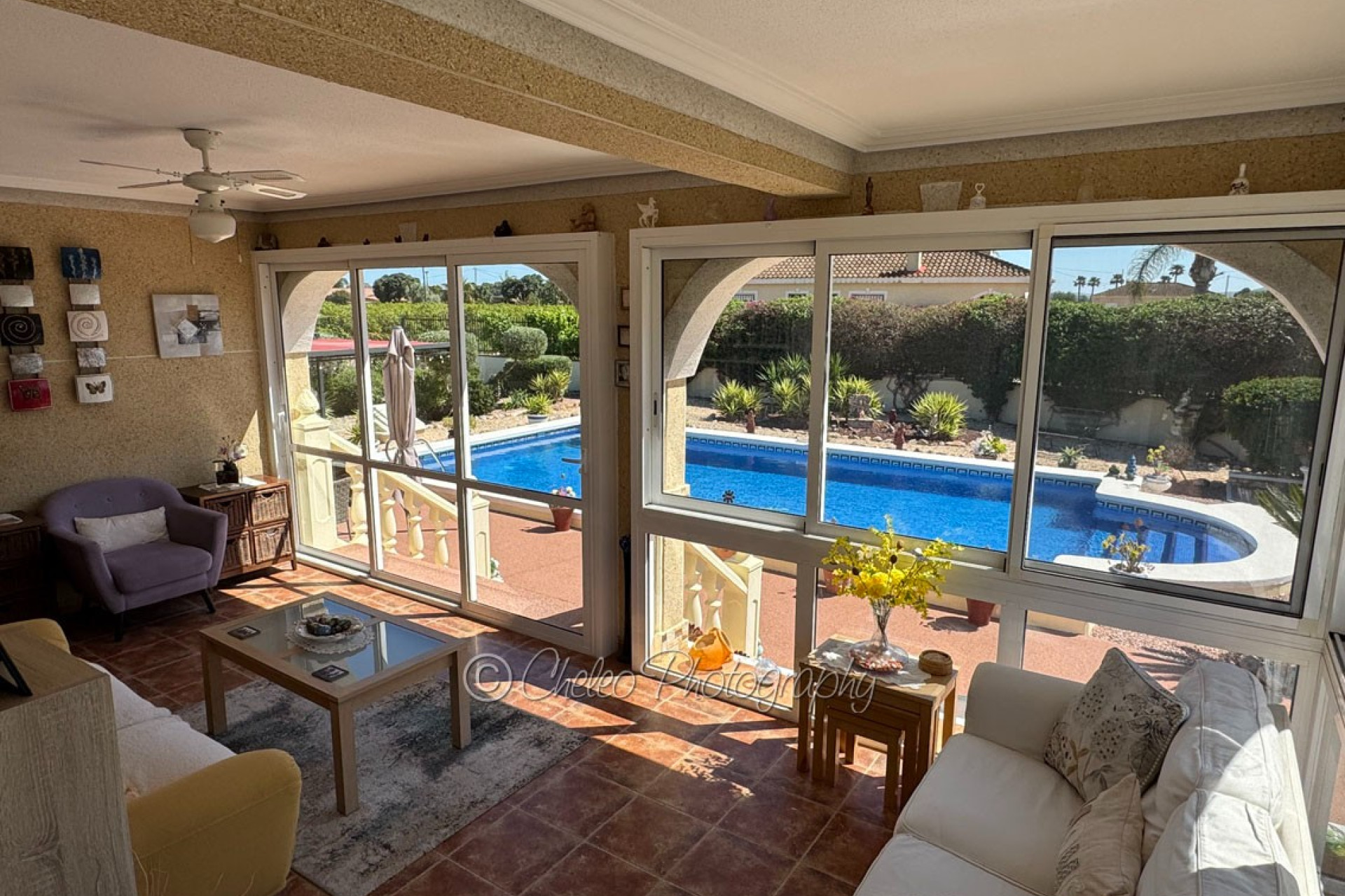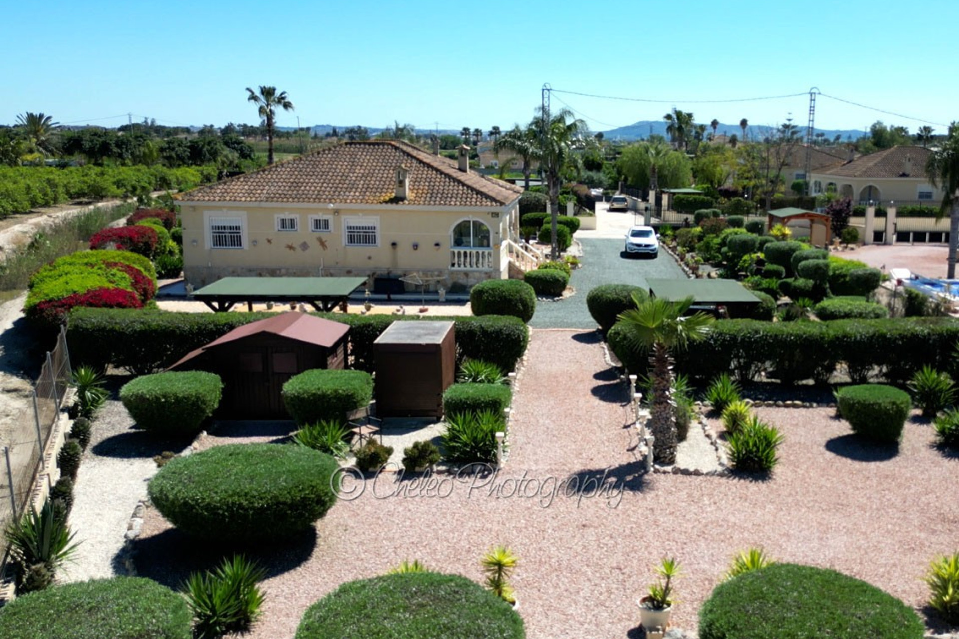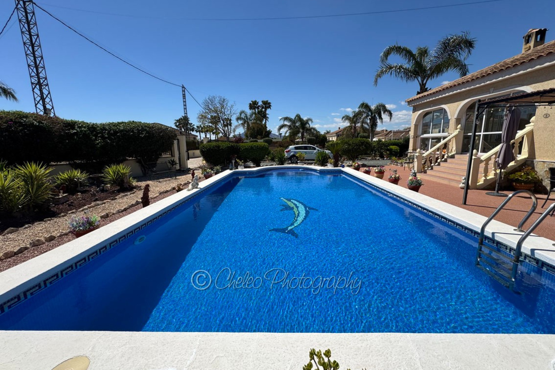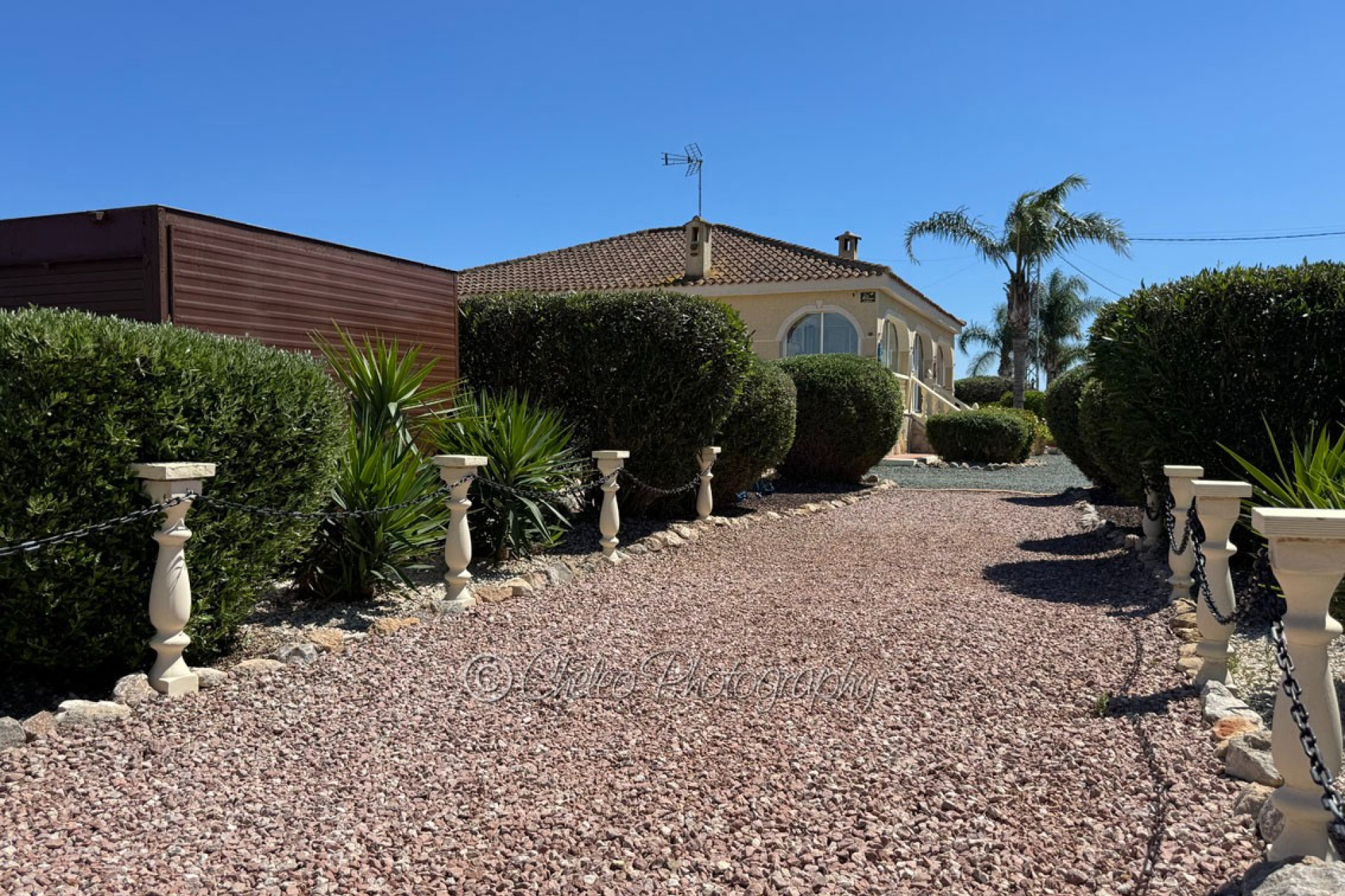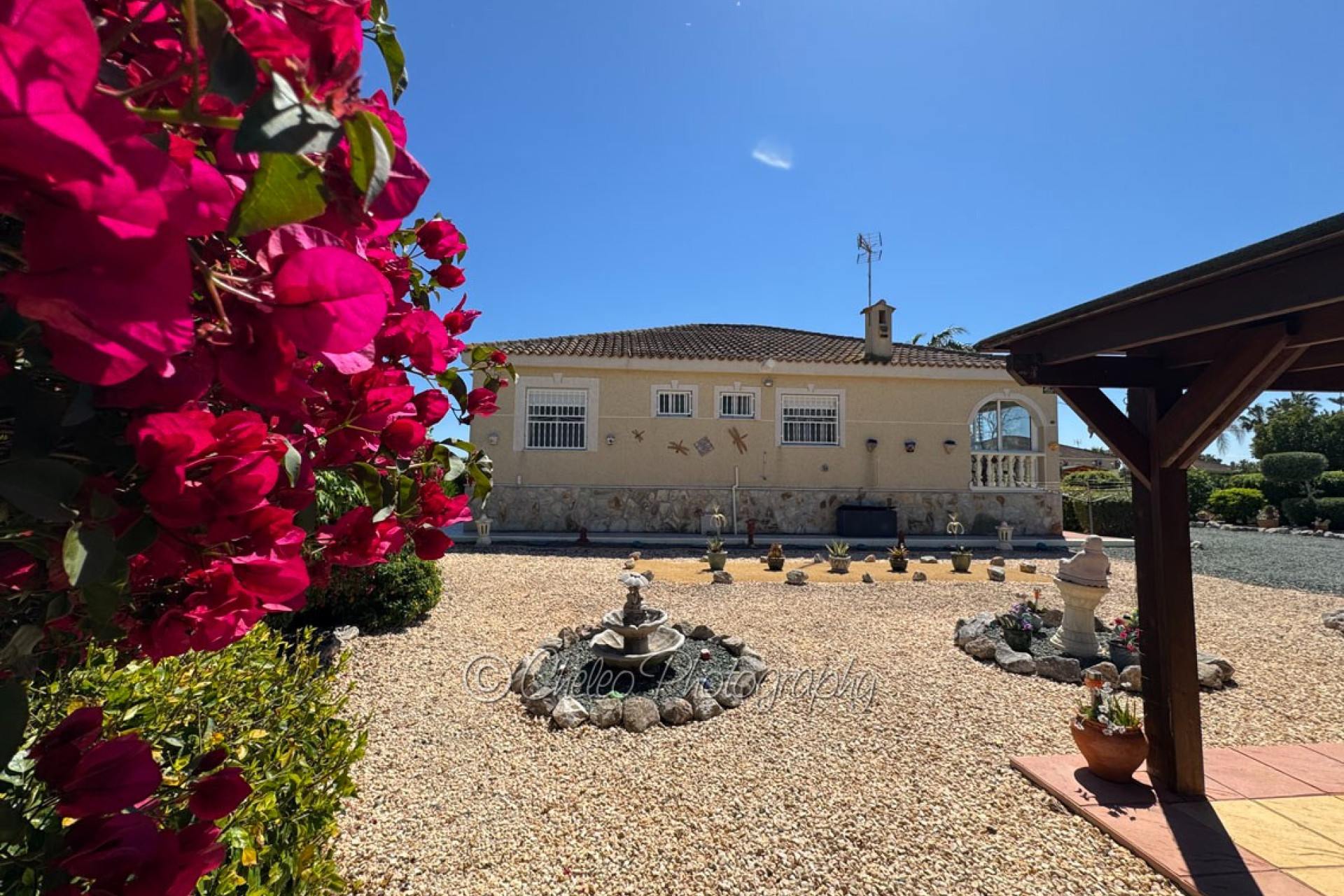 The beautiful 140sq meters home consists of a very large living room with wood burning fireplace, 3 double bedrooms with fitted wardrobes, 2 bathrooms ( master bedroom en-suite), modernised fully fitted kitchen with separate utility room, large fully glazed terrace or conservatory with nice views to the swimming pool. The property has a good size 2,310sq meters plot flat and fully fenced with a stunning landscaped garden with many palm and fruit trees and olive trees. The plot has been laid with gravel making a low maintenance plot and there is pergola area and wooden shed and carport for a car. The size of the private swimming pool is 10m x 5m and has a bathing terrace and a pergola area for shade. Other features include mains electricity, mains water, hot/cold air conditioning, ceiling fans, fibre optic internet, satellite dish, pergola, carport, electric gate, outside lights… This fabulous Villa has a beautiful garden with swimming pool and it is located just 15 minutes from the coast. The property is located at the end of a private road so it is a quiet location and 5 minutes drive from Catral. The information provided is intended as a general guide only and does not constitute a comprehensive statement of facts or legal details regarding the properties offered for sale. It is the sole responsibility of the purchaser and their legal representative to verify all details and establish the legal status of any property prior to completion at the notary. For regular updates on similar properties, please follow us on Facebook.