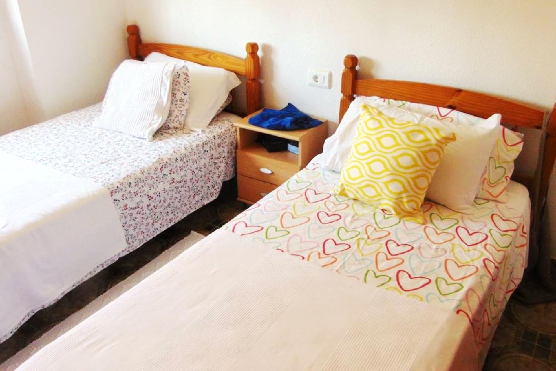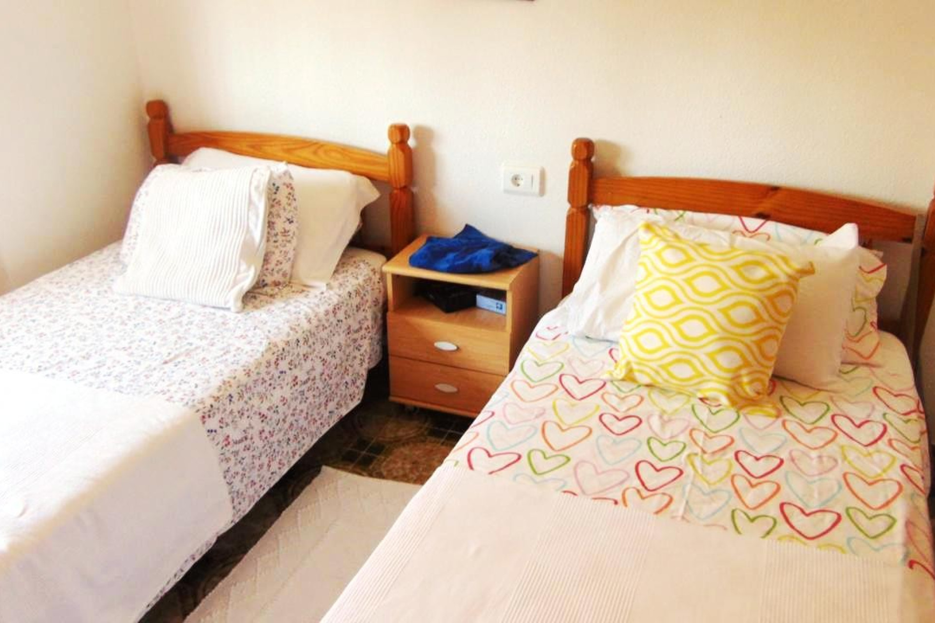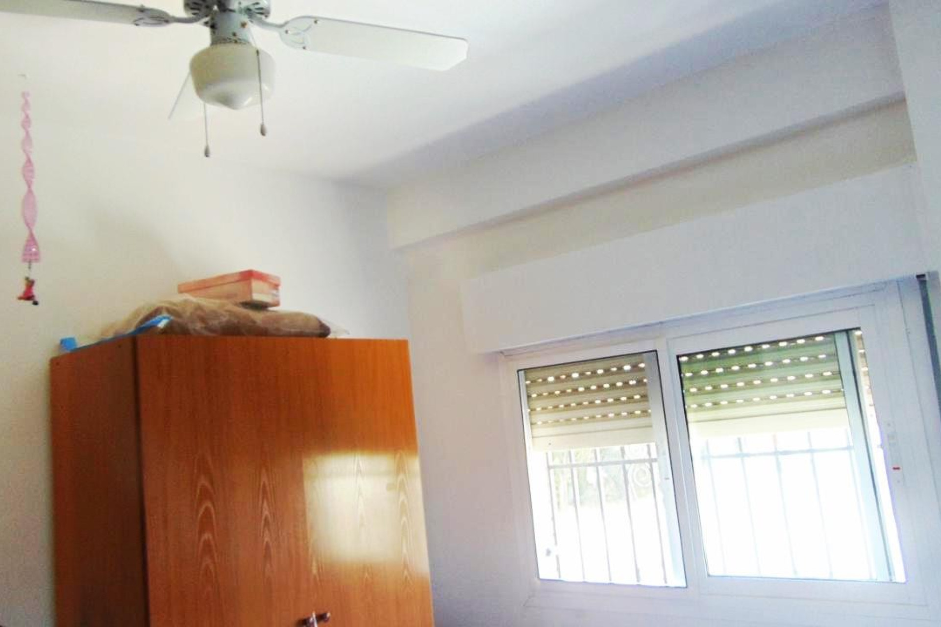 Further we have a twin bedroom with ceiling fan and fitted wardrobes and also another double bedroom with air-con installed and fitted wardrobes. Up here we have a large family bathroom and also a smaller bathroom that could be changed in to another en-suite.