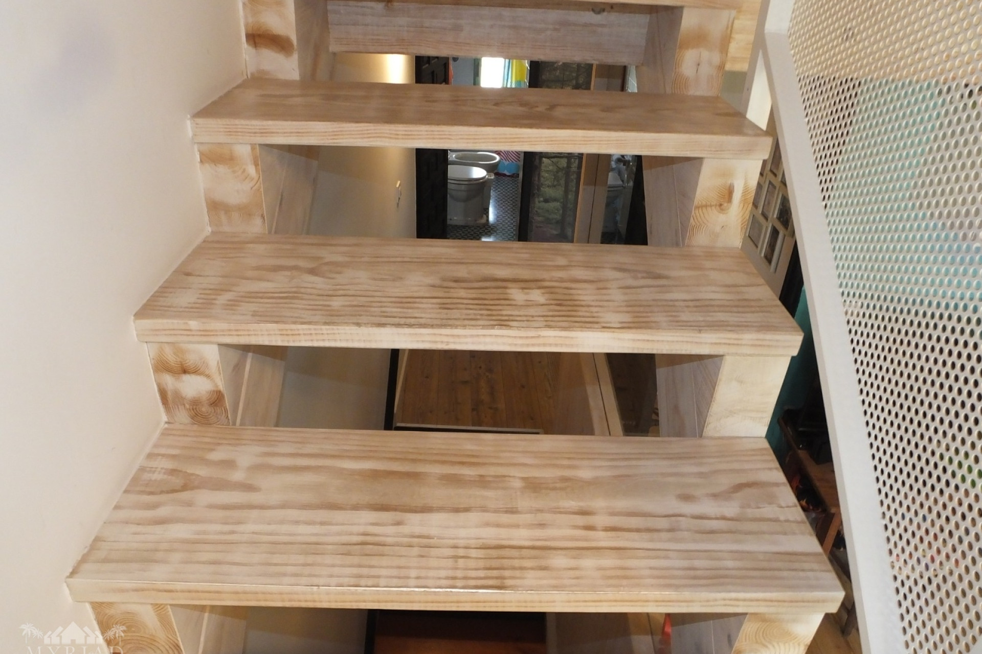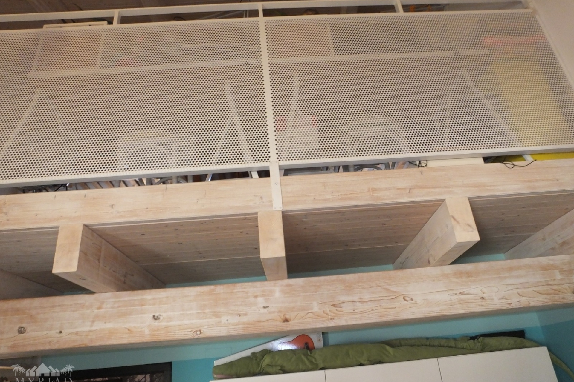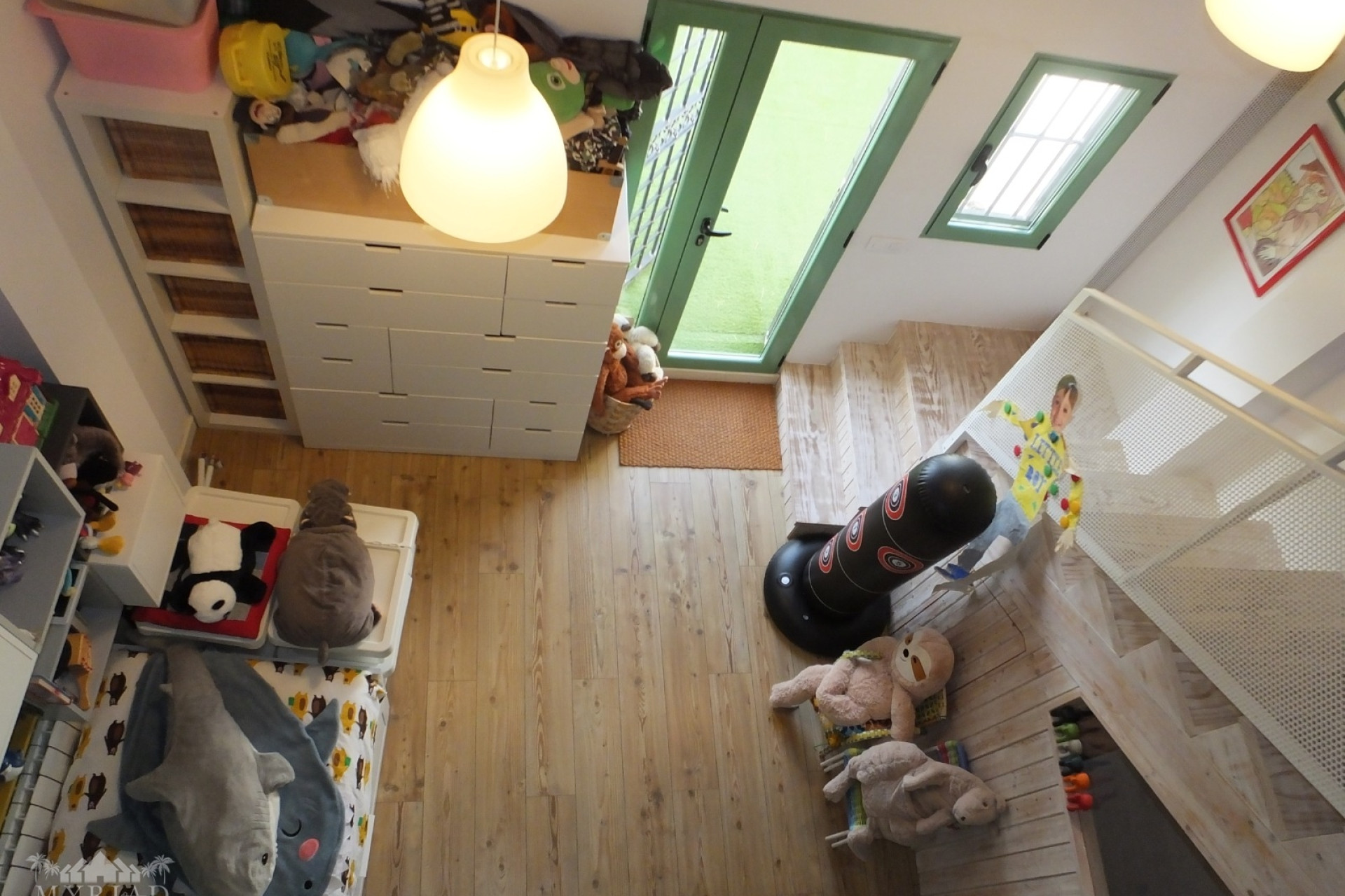 From the second bedroom, there is a staircase leading to a mezzanine level with a third bedroom and study area.