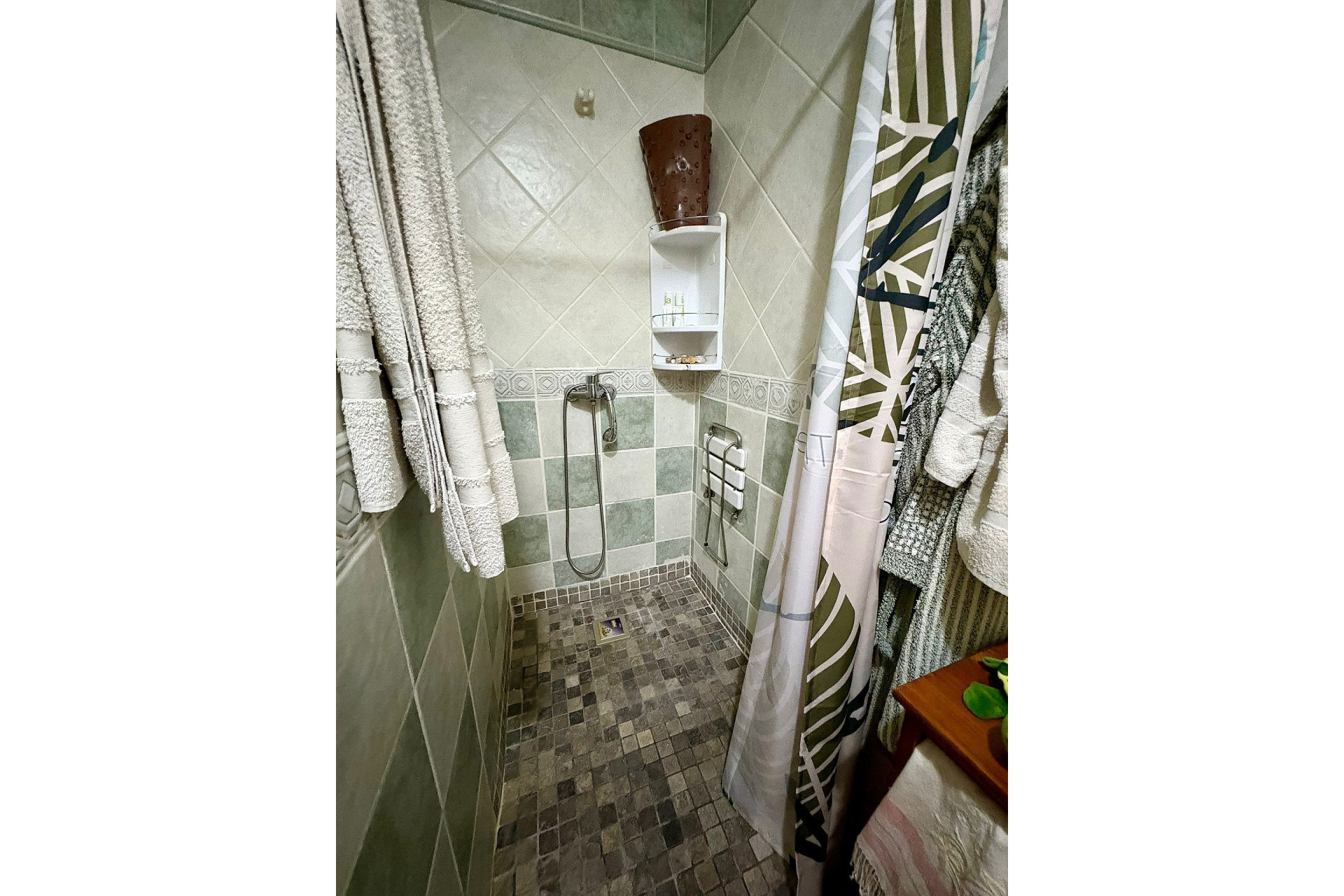 The hallway with utility room, leads to a shower room with WC and basin with vanity unit and on to a really pretty pantry style kitchen, with handmade shelving and storage, newly installed in May 2025. The lovely large traditional kitchen which this leads to also has a dining and lounge area, pellet burner, fireplace and beamed ceiling with a door leading to the gorgeous suntrap private patio, ideal for enjoying.